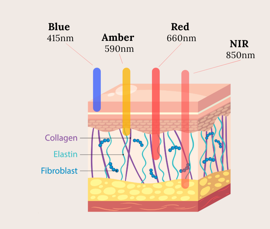 1. Light reaches the lower layers of your skin. Red (around 630–660nm) and near-infrared (810–850nm) wavelengths penetrate the skin without causing harm or heat.